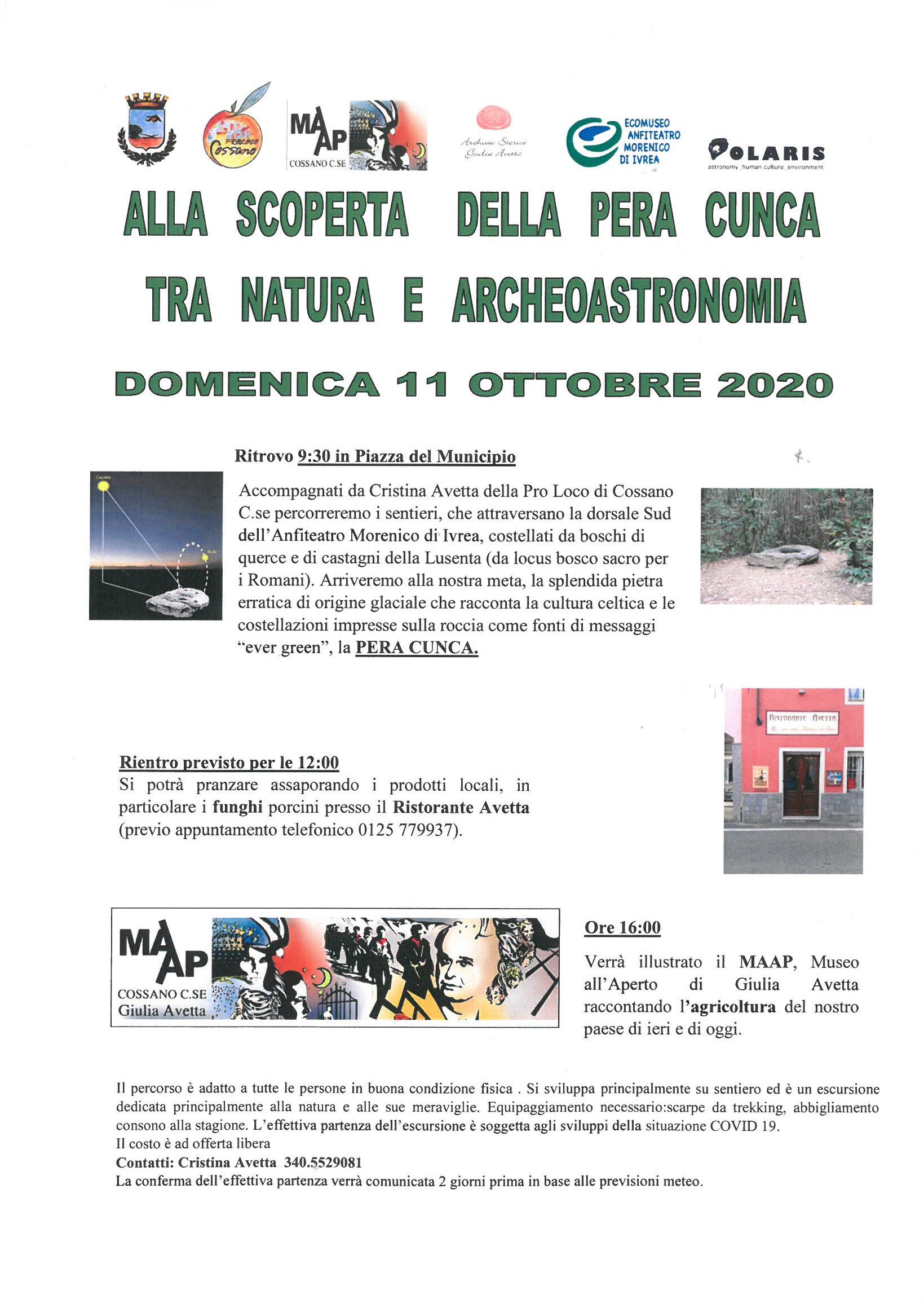 Accompagnati da Cristina Avetta della Pro Loco di Cossano C.se percorreremo i sentieri, che attraversano la dorsale Sud dell'Anfiteatro Morenico di Ivrea, costellati da boschi di querce e di castagni della Lusenta (da locus "bosco sacro per i romani"). Arriveremo alla nostra meta, la splendida pietra erratica di origine graciale che racconta la cultura celtica e le costellazioni impresse sulla roccia come fonti di messaggi "ever green": la PERA CUNCA. Si potranno degustare i prodotti locali , in particolare i funghi porcini presso il Ristorante AVETTA. Nel pomeriggio si visiterà lungo le vie del Paese il MAAP (Museo all'aperto Arte e Poesia di Giulia Avetta).